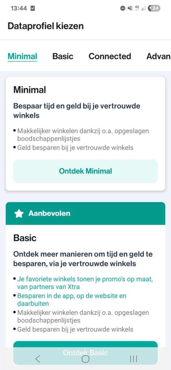 Er zijn dus vier dataprofielen om uit te kiezen: Minimal, Basic, Connected en Advanced. Elk dataprofiel bouwt verder op het vorige, waarbij Minimal het minst uitgebreide is en Advanced het meest uitgebreide. Colruyt zelf raadt aan om Basic te kiezen, maar natuurlijk is de klant vrij om zelf te bepalen welke optie aangeklikt wordt. Sowieso bevat elk dataprofiel de basisvoordelen van Xtra, met name het kunnen aanmaken van boodschappenlijstjes en het kunnen profiteren van de bekende (hoeveelheids)kortingen.
