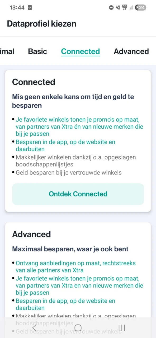 Waar Basic je nog nieuwe winkels liet ontdekken, voegt Connected daar ook nieuwe merken aan toe. Partners van Xtra krijgen bij dit dataprofiel dus meer vrijheid om niet alleen zichzelf te promoten, maar ook specifieke merken die zij in hun winkels aanbieden. Als klant kan je wel zelf bepalen van welke partners je wel en geen marketingberichten wil ontvangen, dus indien gewenst kan je bijvoorbeeld Colruyt en Bio-Planet toelaten en al de rest weren. Dit kan bij je Profiel onder Nieuwsbrieven en folders.