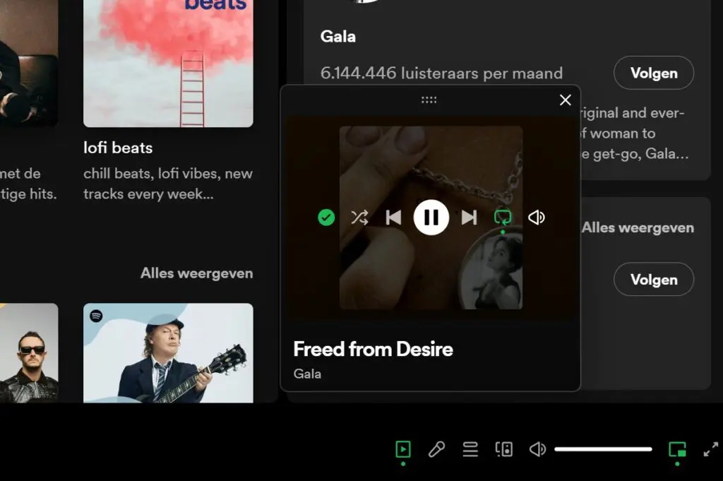 Gebruikers van Spotify op desktop waren al langer vragende partij voor een minispeler. Het grotere bedieningspaneel uit Windows 10 dat als overlay verscheen, heeft in Windows 11 plaatsgemaakt voor een mager volumebalkje, centraal onderaan. Met de nieuwe Minispeler van Spotify kan je het volume bedienen, een track vooruit- of terugspringen en zelfs een andere playlist kiezen.