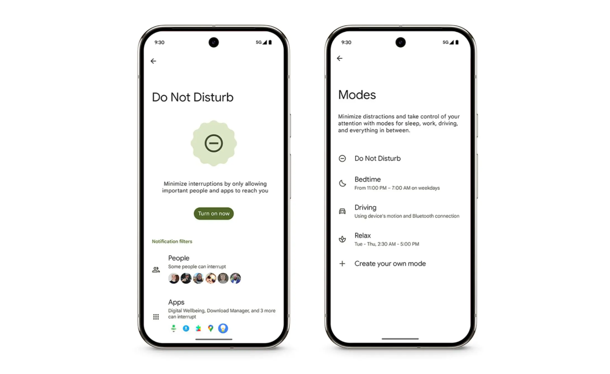 Daarnaast krijgen gebruikers meer vrijheid in hun meldingsvoorkeuren. Zo kunnen ze meldingen van bepaalde apps of specifieke contactpersonen al dan niet blokkeren. Daarnaast wordt het mogelijk om een alarm of media-audio wel of niet hoorbaar te laten blijven. En verder kunnen aan de Modes ook opties voor grijstinten, een donkere modus of gedimde achtergrond gekoppeld worden. Je kunt een modus activeren via de instellingen of de nieuwe Quick Settings-tegel, waarbij meerdere modi tegelijk kunnen werken.