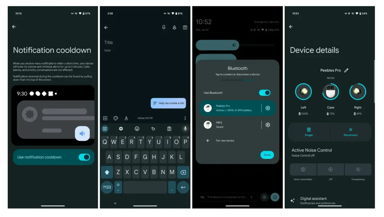 Wanneer je in korte tijd veel meldingen ontvangt, verlaagt je toestel automatisch het meldingsvolume en minimaliseert het meldingen voor maximaal twee minuten. Een zogenaamde ‘cooldown’ voorkomt dat je overspoeld wordt met meldingen. In Gboard, het custom toetsenbord van Google, zal het wereldbolicoontje niet meer zichtbaar blijven als je slechts één toetsenbordtaal hebt ingesteld. Ook handig is dat de batterijpercentages van verbonden bluetooth-apparaten voortaan weergegeven worden in de instellingen. En verder krijgt de QR-code waarmee je een wifinetwerk deelt een modernere Material You-look.