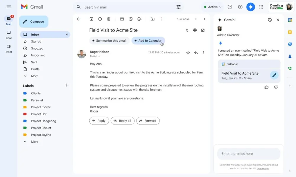 Om deze functie mogelijk te maken, analyseert Gmail de e-mail en verzamelt het systeem gegevens zoals de datum, het tijdstip en andere relevante details. Mocht Gemini onjuiste informatie hebben opgehaald, dan kan je dit direct aanpassen via de Gemini-chatbot in Gmail door op het bewerkingsicoon te klikken. Ook is het mogelijk om de AI-assistent te vragen bepaalde details te wijzigen.