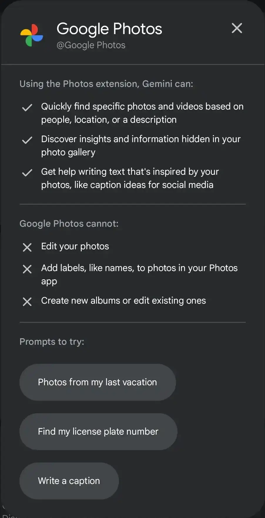 De eerste functie laat je rechtstreeks vanuit Gemini foto’s en video’s zoeken met behulp van natuurlijke taal. Je kan Gemini bijvoorbeeld vragen om alle foto’s van afgelopen zomer of je recente selfies te tonen. De AI kan zelfs specifieke personen voor je opzoeken, mits je deze personen eerder een naam hebt gegeven in Google Foto’s. Ook kan de AI zoeken op locaties en beschrijvingen van wat er op een foto te zien is.