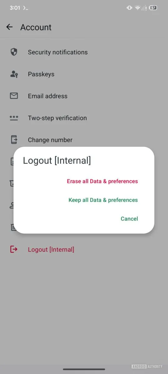 In versie 2.25.17.37 van WhatsApp Beta is nu een nieuwe ‘Logout’-knop opgedoken in het Account-menu. De knop toont een pop-up met twee keuzes: