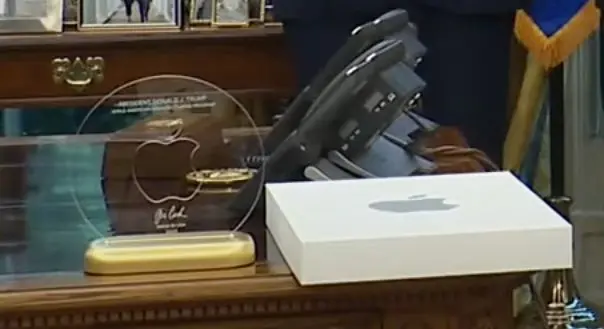 Hoe dan ook ging het er tijdens de gezamenlijke persconferentie in het beroemde Oval Office van het Witte Huis vrolijk en gezellig aan toe. Tim Cook, CEO van Apple, en president Trump hadden lovende woorden voor elkaar en aan het begin had Cook ook nog een speciaal cadeautje voor Trump. Hij onthulde een “made in USA” trofee ter ere van het American Manufacturing Program dat onder Trump gelanceerd wordt. Het glas, met het Apple-logo erin, werd door Corning gemaakt en is ontworpen door een voormalige korporaal van het Amerikaanse marinierskorps die nu bij Apple werkt. De basis waar het glas in rust komt uit Utah en bestaat voor 99,99% uit puur goud.