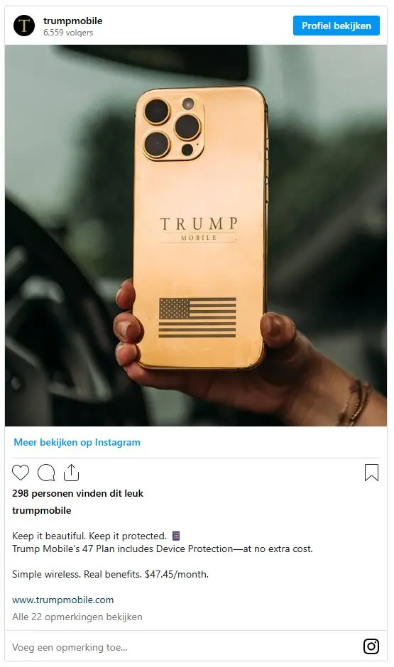 Ook via Instagram duikt plots een heel andere Trump Phone op. Deze keer gaat het duidelijk om een iPhone 16 Pro Max die opnieuw aangepast werd om er als een goudkleurige telefoon uit te zien, met een logo van Trump Mobile erop en opnieuw een Amerikaanse vlag om het doelpubliek aan te spreken, ook al heeft de Trump Phone dus bitter weinig met “Made in America” te maken.