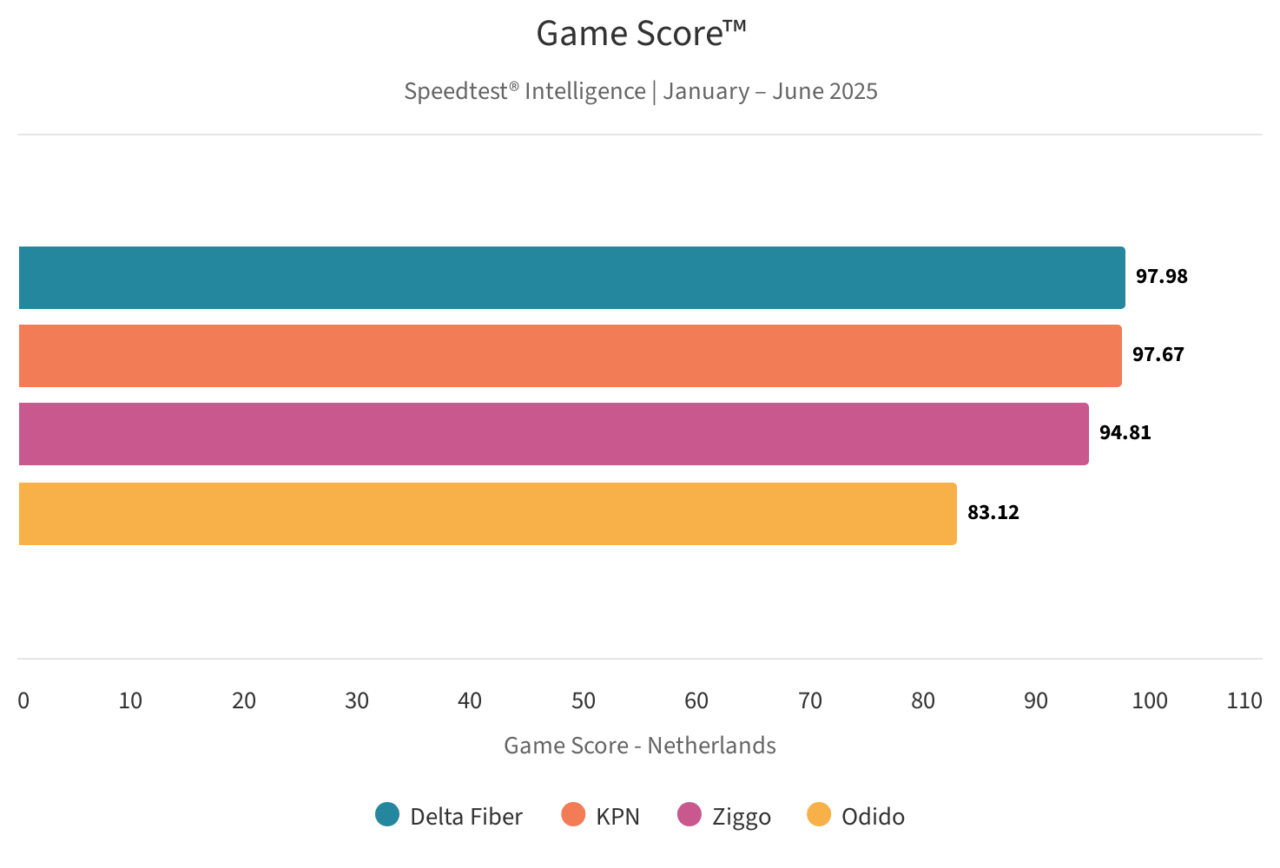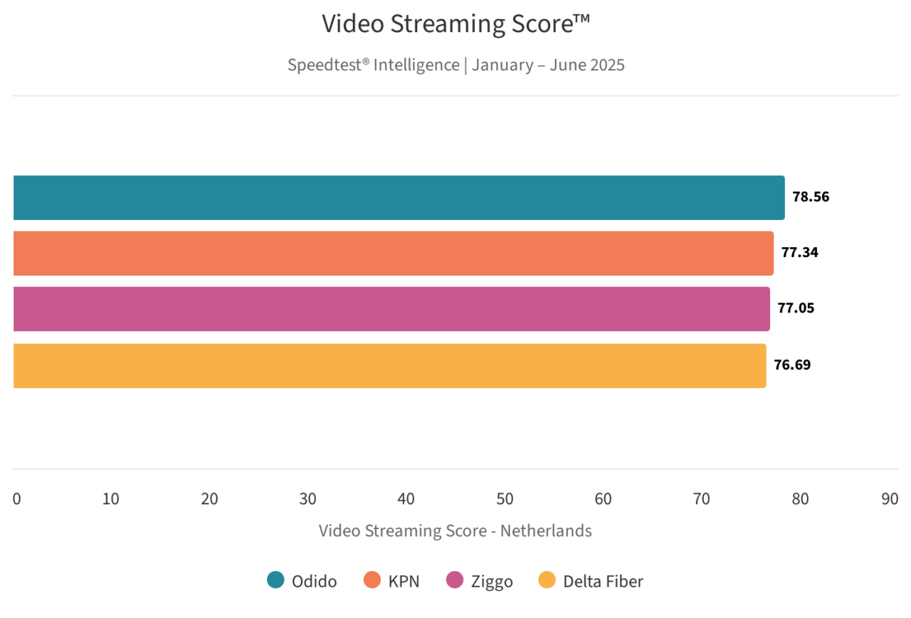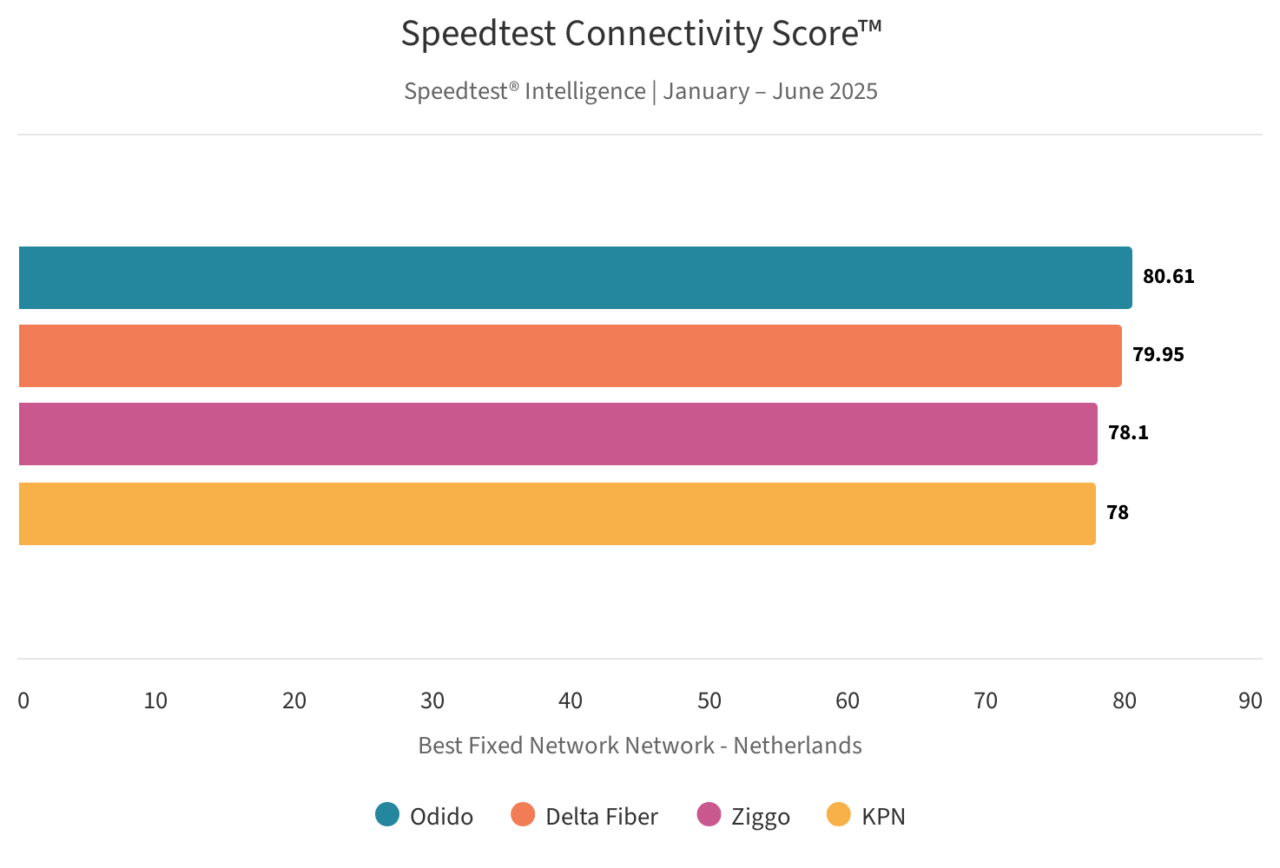 In de eerste helft van 2025 had Odido het beste vaste netwerk van alle internetproviders in Nederland, gevolgd door Delta Fiber, Ziggo en KPN, al liggen de scores wel dicht bij elkaar. De Connectivity Score die gebruikt wordt, houdt rekening met verschillende andere scores, waaronder die van de snelheid, het streamen van video’s en de algemene surfervaring.