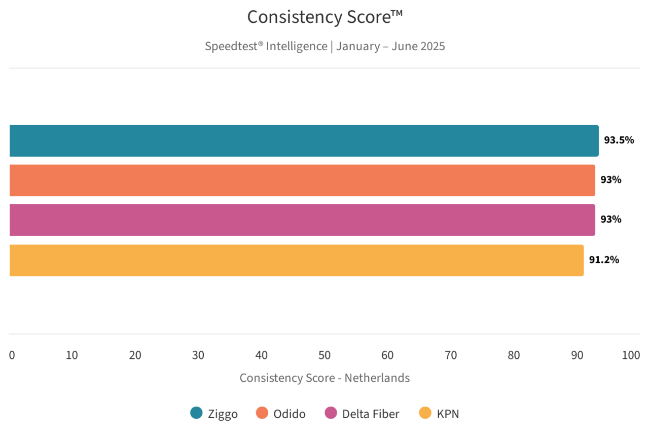 Wat betrouwbaarheid betreft, is er volgens Ookla statisch geen verschil tussen de verschillende providers. Ziggo staat strikt genomen op de eerste plaats, maar is in de praktijk eigenlijk even consistent als Odido, Delta Fiber en KPN.