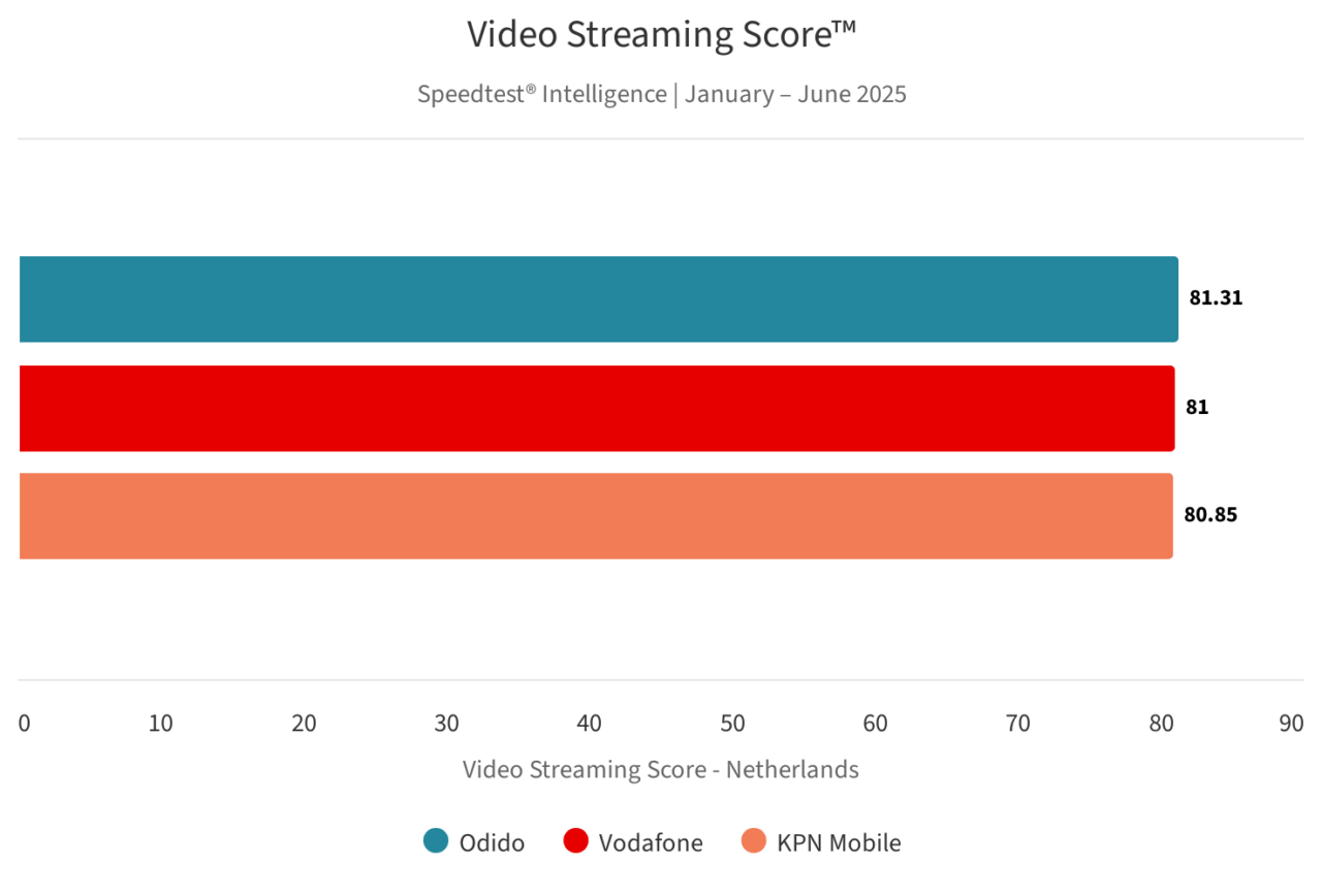 Odido had in de eerste helft van 2025 in Nederland het beste mobiele netwerk, zowel in het algemeen als wat 5G specifiek betreft. De provider haalde een Speedtest Connectivity Score van 84,34 en een Speedtest 5G Connectivity Score van 77,11. De top 3 wordt vervolledigd door KPN Mobile en Vodafone.