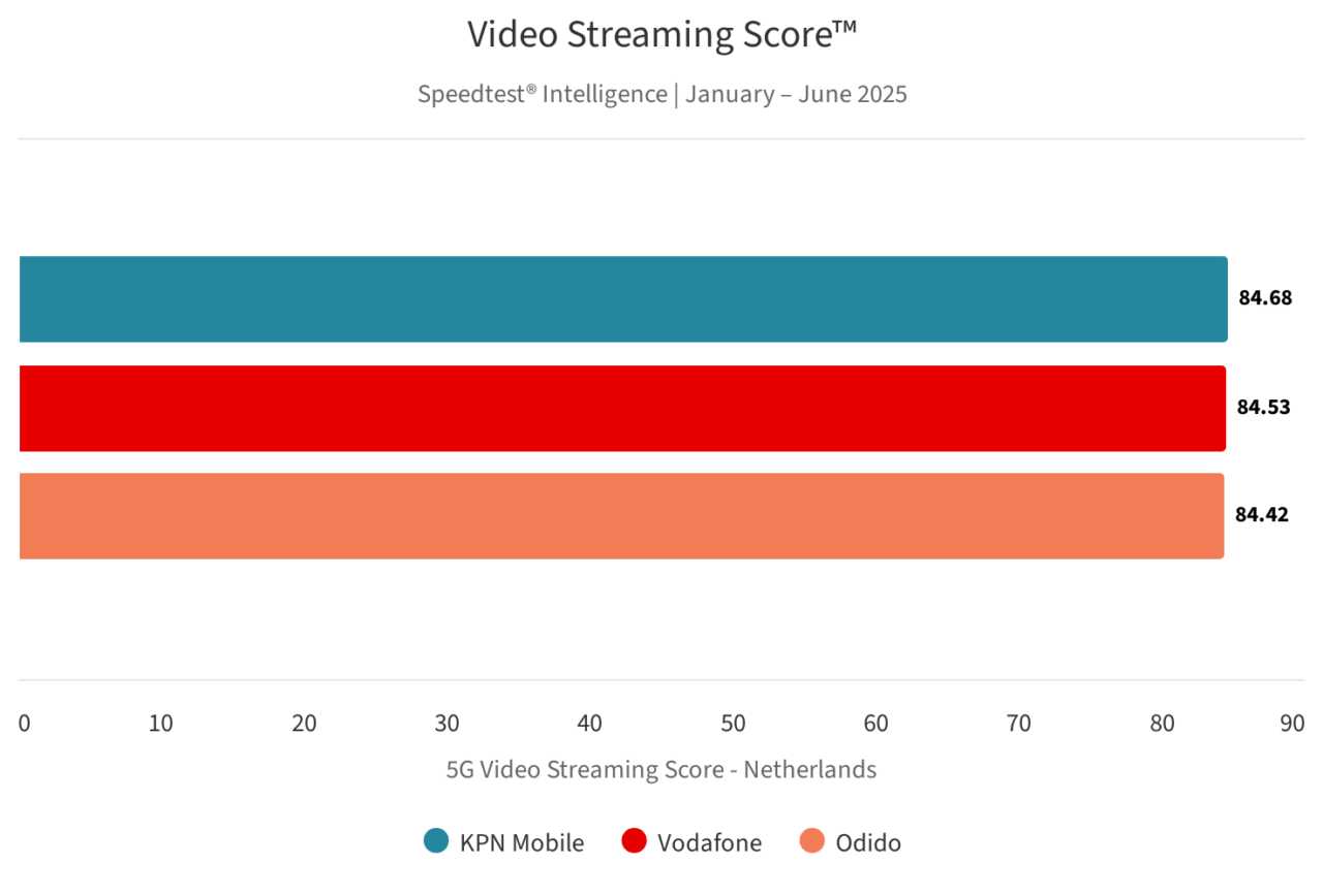 Voor het streamen van video’s via een vast netwerk liggen de scores opnieuw dicht bij elkaar, al deed Odido het net iets beter dan de rest. Voor deze score wordt gekeken naar zaken als starttijd, buffering en resolutie.