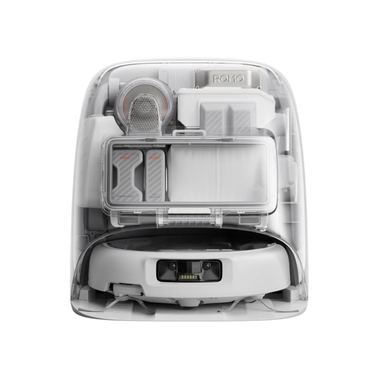 De robotstofzuiger heeft twee borstels vooraan, die het vuil naar het midden brengen. Daar zitten twee rollers naast elkaar, met in het midden een opening, waar het vuil naar binnen wordt gezogen. Die opening tussen de rollers is een handigheidje dat vermijdt dat lange haren zich vasthaken in de roller en insnijdingen maken, iets dat vaak gebeurt bij robots die rollers over de volledige lengte hebben. De stofzuiger zelf heeft een zuigkracht van 25.000 pascal, wat in vergelijking met veel standaard stofzuigers al erg veel is. Tot 20 liter lucht per seconde kan er naar binnen stromen.