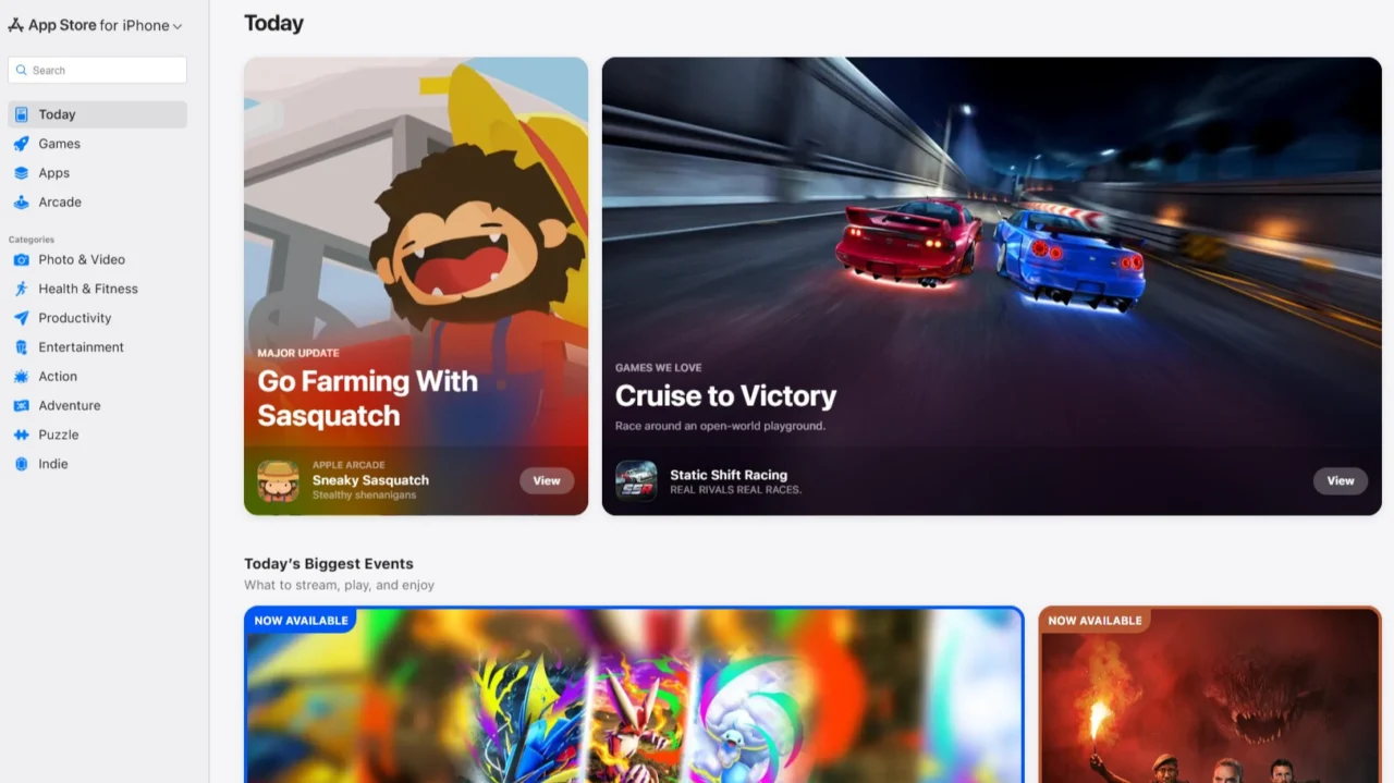 De website van de App Store was maar heel mager, maar Apple heeft daar verandering in gebracht. Je kan nu gewoon zoeken tussen de apps, lijsten met updates in apps, events en andere highlights bekijken, de apps volgens categorie bekijken en alles wat je in de App Stores van de verschillende platformen kan doen. Alleen een app installeren kan niet vanaf de website. Een al geïnstalleerde app kun je wel openen vanaf de website.