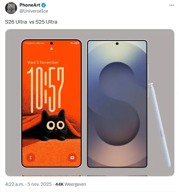 De Ultra wordt dan wel wat ronder, het tegenstelde lijkt het geval voor de gewone S26. Tenminste, dat vertelt diezelfde UniverseIce. Dat is dan weer minder problematisch, want dat is een iets kleiner toestel. Het was vooral bij de Ultra dat de gebruikers klaagden over het toestel dat in de handen sneed.