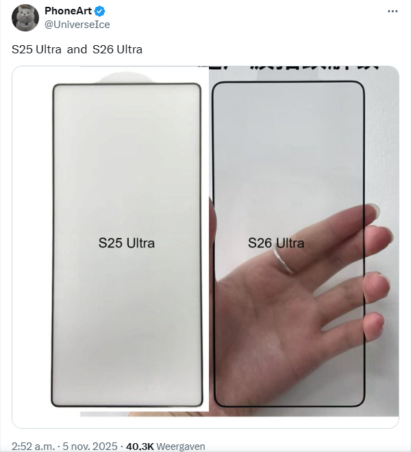 De grote varianten van Samsungs topmodel kregen de jongste generaties redelijk scherpe hoeken. Wie de telefoon vaak in zijn of haar broekzak stopt, kan dat daardoor onaangenaam vinden. Dat hoeft niet te verbazen bij een toestel van zo’n 16 op 7,7 cm. Qua afmetingen lijkt de S26 Ultra maar iets groter te worden dan zijn voorganger. Om te vergelijken met de bekende Amerikaanse tegenhanger: de iPhone 17 Pro Max heeft nog altijd meer afgeronde hoeken dan de S26 Ultra. De beelden van de toestellen en de screenprotectors komen van leaker @UniverseIce.