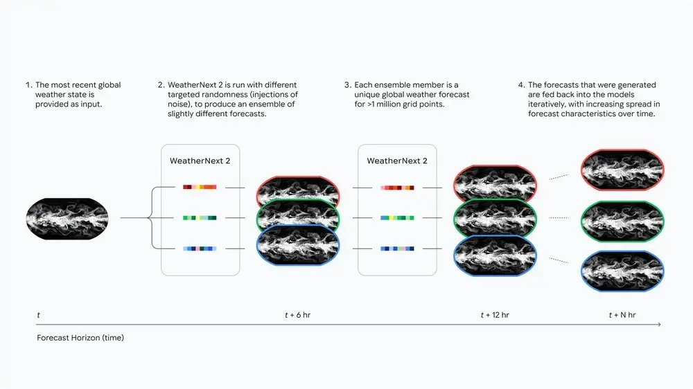 WeatherNext 2 is in staat om acht keer sneller te voorspellen voor periodes tot op één uur nauwkeurig. De input start met de recentste weergegevens wereldwijd. Doordat een Functioneel Generatief Netwerk (FGN) ‘ruis’ (noise) in zijn modelarchitectuur injecteert, creëert het voorspellingen die realistisch en met elkaar verbonden zijn. Die injectie van willekeur klinkt vreemd, maar zorgt er net voor dat je een accurater resultaat krijgt. Zo krijg je zeer juiste voorspellingen voor ‘marginals’. Dat zijn letterlijk randgevallen, met andere woorden precieze temperaturen en windsnelheden op een specifieke locatie en op een specifieke hoogte.