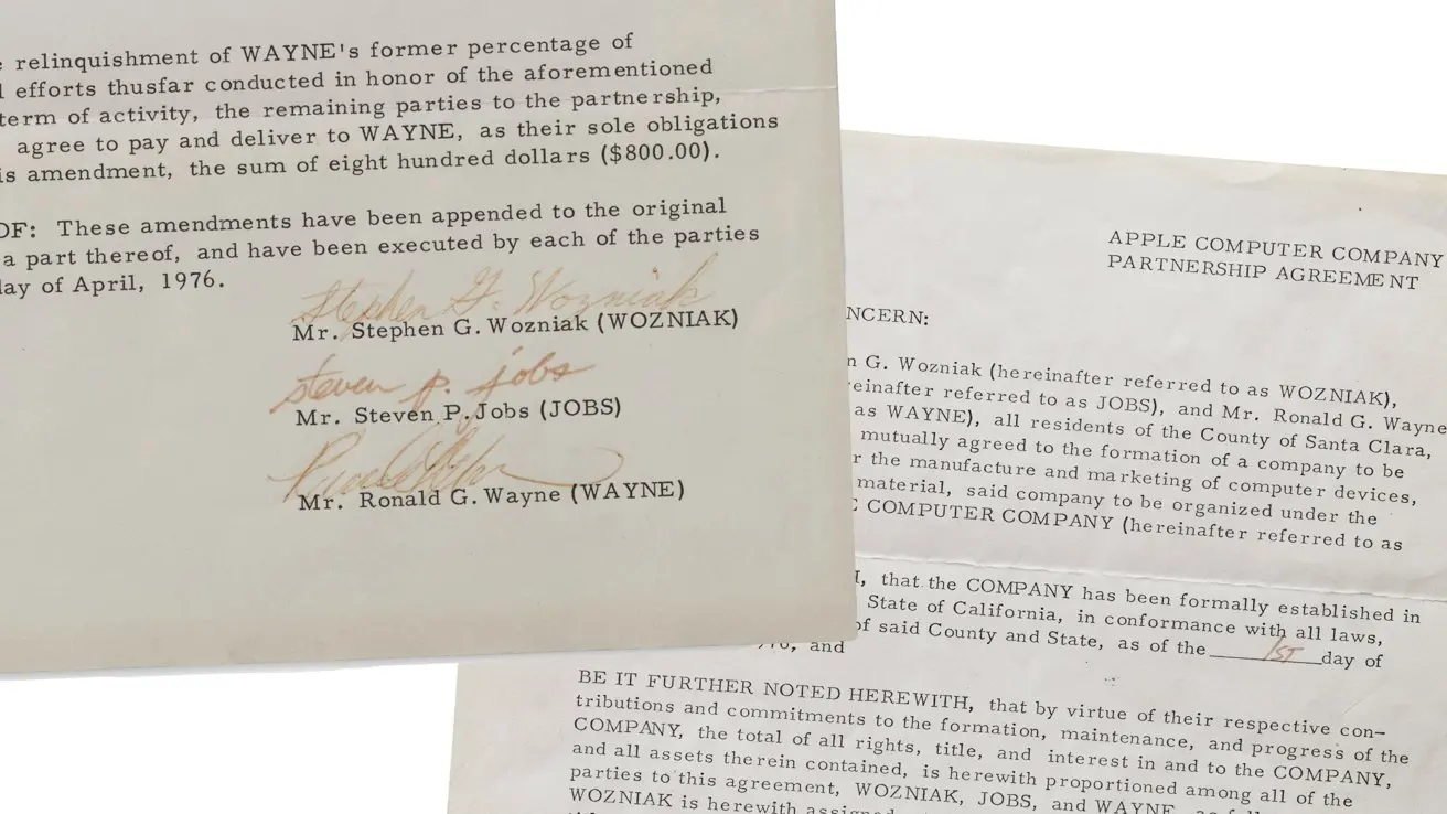 De overeenkomst telt drie pagina’s en werd in 1976 ondertekend door Steve Jobs, Steve Wozniak en Ron Wayne. Apple Computer Company, zoals het bedrijf toen heette, werd zo officieel opgericht en zou uiteindelijk evolueren naar het Apple dat we nu kennen.