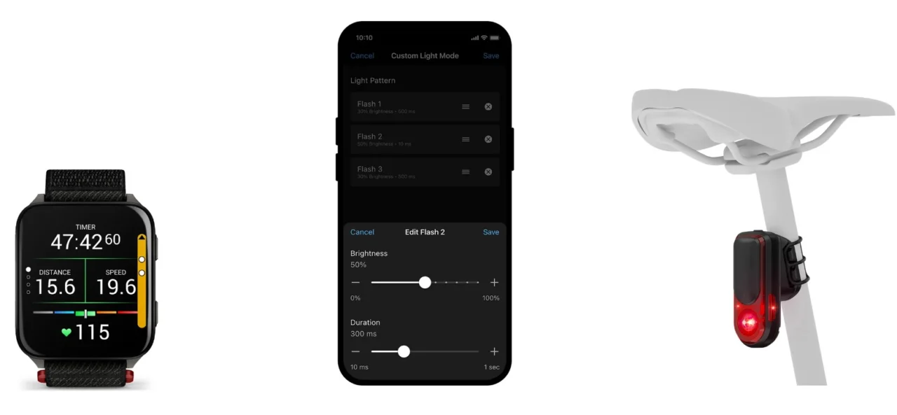 Zo’n radar heeft eveneens een achterlicht. Garmin meldt dat dit zijn helderste achterlicht tot nu toe is. Net zoals bij de lichten van Trek is het zichtbaar tot op meer dan 2 kilometer afstand. Je hebt standaard de dagflits, nachtflits, continu en pelotonmodus. In de Varia-app kun je zelf lichtpatronen samenstellen, waarbij je de helderheid en knipperduur kiest.