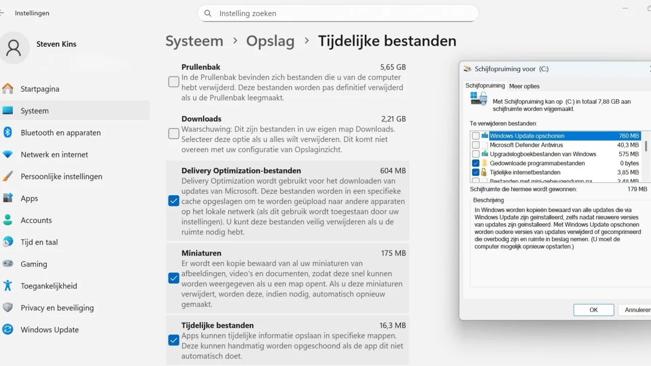 Dat betekent dat in de instellingen voor Opslag niet meer wordt gescand in de gevoeligere niveaus. Daardoor krijg je die updatebestanden daar niet meer te zien. Bij Schijfopruiming kan je er wel voor kiezen om specifiek de Systeembestanden te zien te krijgen. Daar lukt dat dus wel nog. Het verschil zie je in de foto hierboven, waar je de instellingen op de achtergrond ziet en het kleiner scherm van de Schijfopruiming op de voorgrond.