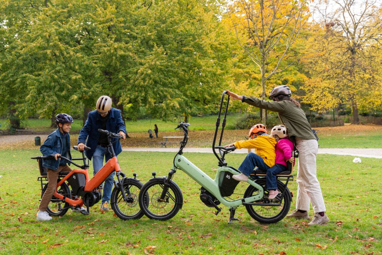Zelfs op de Bike 43 Short kun je al twee kinderzitjes monteren. Worden de kinderen te groot daarvoor, dan kun je gewoon de neerklapbare rail monteren. Die klapt omhoog en omlaag, zoals je dat wat gewoon bent in een kermisattractie. Daardoor kunnen ze veel vlotter opstappen en zitten ze toch beschermd als je de rail neerklapt. Dat zijn natuurlijk allemaal accessoires die je er moet bijkopen, net zoals bijvoorbeeld de voordrager en de optionele bakken.
