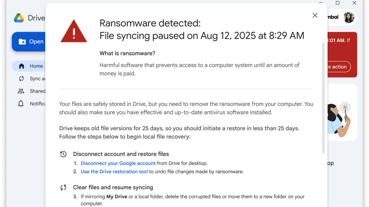 Het systeem herkent nu zelfs al meer soorten ransomware-encryptie dan in de bètaversie en werkt sneller. Het jongste AI-model detecteert 14 keer meer infecties. Als je Google Drive for desktop op je computer hebt staan, stopt het synchroniseren van bestanden als er ransomware is vastgesteld. Je krijgt een melding te zien, die ook naar de admin wordt gestuurd. Beiden krijgen eveneens een waarschuwingsemail. Het is dus niet meteen een preventieve functie, maar wel een die zo snel mogelijk ingrijpt. Als dat gebeurt, kan je overgaan naar de stap van het bestandsherstel.