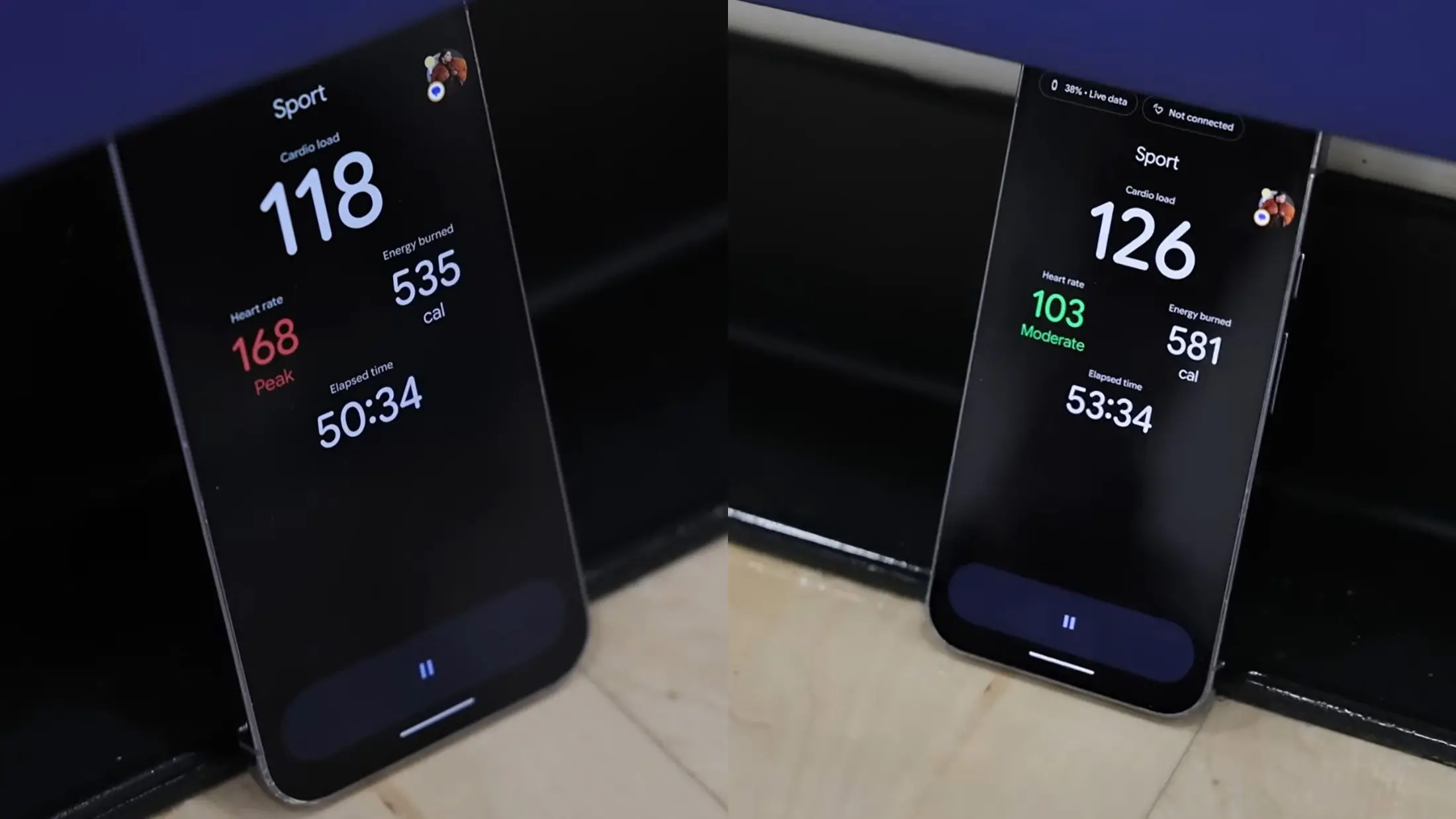 Misschien nog interessanter dan de foto’s van de fitnessband zelf zijn de beelden van de software. Ook hier lijkt het specifiek te gaan om de app die verbonden is met de nieuwe fitnessband. Tijdens een training in het All-Star-weekend droeg Curry de Fitbit en gleed de camera over de telefoon van de basketspeler. Daar zien we dat de Pixel-smartphone een activiteit aan het opnemen is. De app lijkt op die van de Fitbit-software, met eenzelfde pauzeknop onderaan het scherm. We zien de cardiobelasting, hartslag, verbrande calorieën en verstreken tijd. Ook staat er bovenaan het scherm dat het gaat om live gegevens en dat het batterijniveau van het verbonden apparaat nog 38% bedraagt.