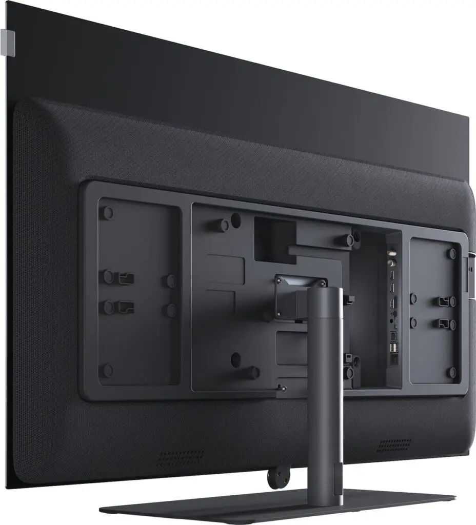 Terwijl de tv zelf lekker dun is, steekt de behuizing aan de achterkant wel wat uit als een bult (totale diepte 6,4 cm), iets om rekening mee te houden als je hem dicht tegen de muur wil ophangen. De bild i.48 lijkt dan ook eerder ontworpen als een staande tv, want Loewe voorziet verschillende (niet meegeleverde) standaarden. We appreciëren ook dat je kabels in de voet kan wegwerken en dat Loewe twee magnetische afdekplaten meelevert om de achterkant van de tv te bedekken. Verder is die overtrokken met mesh. De bild i.48 ziet er zo bijzonder netjes uit als je hem vrijstaand wil plaatsen en de achterkant zichtbaar is. De afstandsbediening, tot slot, is van geborsteld metaal en voelt gewichtig aan. Ontwerpsgewijs slaagt Loewe erin een kwaliteitsgevoel te creëren waarmee het zich wel degelijk onderscheidt van de concurrentie.