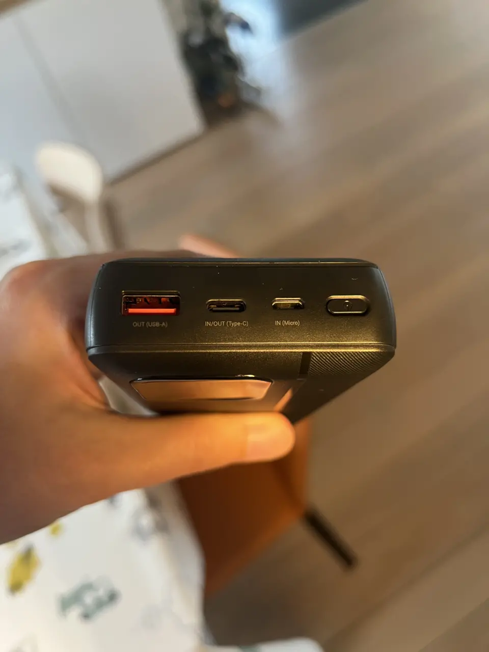 Naast het display zijn we ook een grote fan van de ingebouwde usb-c- en Lightning-kabels. Ze zijn geïntegreerd in de powerbank en als je ze niet gebruikt, zitten ze om de powerbank heen gevouwen en vastgeklikt, zonder dat ze uitsteken. De laadprestaties zijn prima (naar ons gevoel zelfs beter dan die van het meegeleverde usb-c-kabeltje). Dankzij die twee meest voorkomende connecties hoef je geen extra kabels mee te sleuren. Heb je toch nog een toestel met een andere aansluiting, zoals micro-usb, dan kan je de kabel van dat apparaat nog altijd aansluiten op de usb-a-poort van de powerbank. Draadloos opladen ontbreekt hier wel, mocht je daarnaar op zoek zijn.