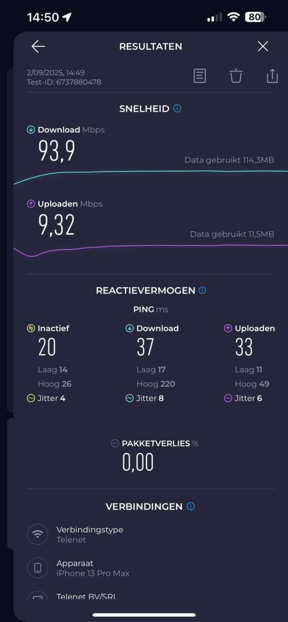 De wifi-adapter die we in de woonkamer bij ons tv-meubel verbonden verhielp meteen de wegvallende connectie van onze smart-tv. Het draadloze signaal van onze modem (in de garage) moest immers door drie muren heen en zo’n 20 meter afstand afleggen. Het is een scenario waar veel lezers zich in zullen herkennen. Het voelt dan ook bijzonder goed om dat obstakel eenvoudigweg te overwinnen: eindelijk weer streamen zonder haperingen. Eerdere Wi-Fi 6 Powerline-adapters van Devolo waren in theorie goed voor snelheden tot 1.800 Mbps. De Devolo Magic 2 Wi-Fi 6 next Multiroom Kit belooft 3.000 Mbps, al zijn dat soort theoretische snelheden eigenlijk vooral marketing. Bij wijze van praktijktest namen we onze smartphone erbij voor een snelheidstest. Zowat overal in huis haalden we resultaten van rond de 90 Mbps aan downloadsnelheid. In ons geval was er amper verlies te noteren tegenover de 100 Mbps die ons internetabonnement mogelijk maakt.
