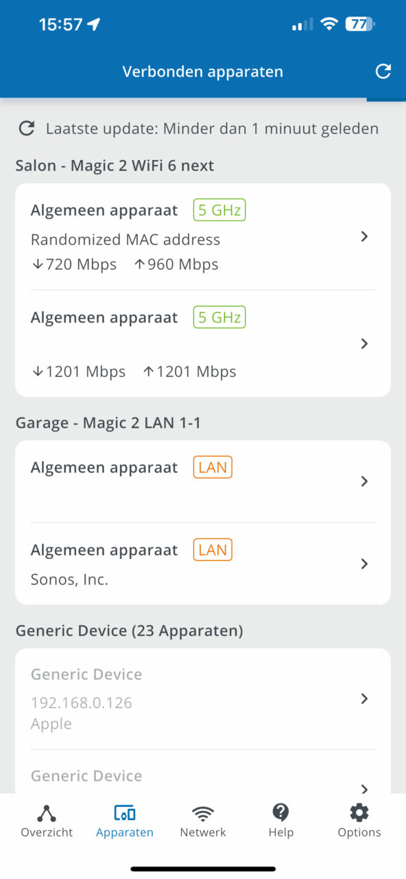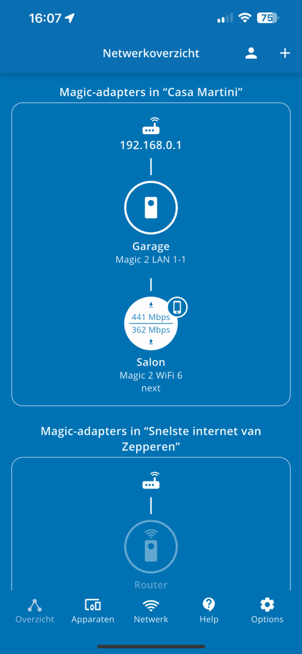 De Devolo Magic 2 Wi-Fi 6 next Multiroom Kit bevat 3 adapters: een kleinere die een LAN-connectie via powerline biedt en twee grotere adapters die over twee netwerkpoorten beschikken én kunnen fungeren als Wi-Fi 6-toegangspunten. Over de installatie van de adapters kunnen we kort zijn: die nam amper enkele minuten in beslag. Als leek kan het misschien afschrikken om nieuwe toestellen aan je thuisnetwerk toe te voegen, maar ‘plug-and-play’ mag je hier wel heel letterlijk nemen. In de Home Network-app van Devolo heb je via het plusje de optie om nieuwe toestellen toe te voegen. De app loodst je dan handig door de stappen. Maar zelfs dat was bij ons niet nodig. Van zodra we de LAN-adapter naast onze modem inplugden en beide met elkaar verbonden, zagen we de adapter al in het netwerkoverzicht van de app.