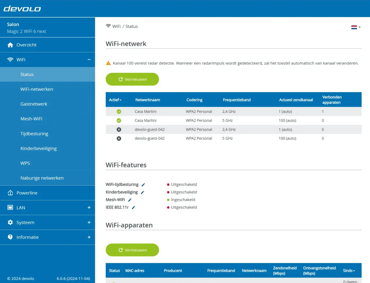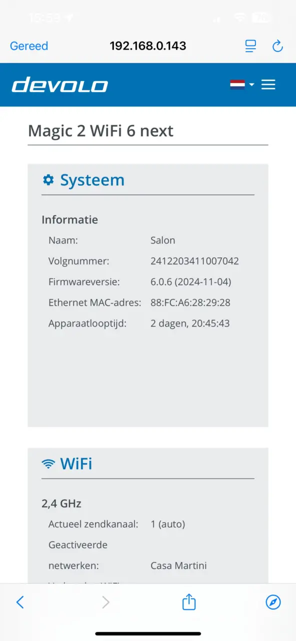 De Devolo Home Network-app toont zich van zijn sterkste kant bij de installatie. Elke papieren handleiding wordt eigenlijk overbodig en dat zien we bij dit soort producten zelden tot nooit. Bovendien kan je in de app een stuk meer dan de modem van je internetprovider tegenwoordig toelaat. Om te beginnen is het visuele schema van adapters superhandig en kan je daarop doortikken om te kijken welke toestellen ermee verbonden zijn. Tip: geef ze als naam de kamer of plek waar ze insteken. Nog meer informatie krijg je door verder te tikken op ‘Open webinterface van je apparaat’, of het IP-adres van de adapter in te geven in de adresbalk van je browser. Daar kan je schakelen tussen wifikanalen, 2,4 of 5 Ghz, tijdbesturing en (kinder)beveiliging configureren en de status van je netwerk tot in detail bekijken. Om maar te zeggen dat Devolo Magic 2 Wi-Fi 6 next Multiroom Kit meer is dan zomaar een setje wifi-adapters: het is een volwaardige vervanging voor de routerfuncties van je modem.