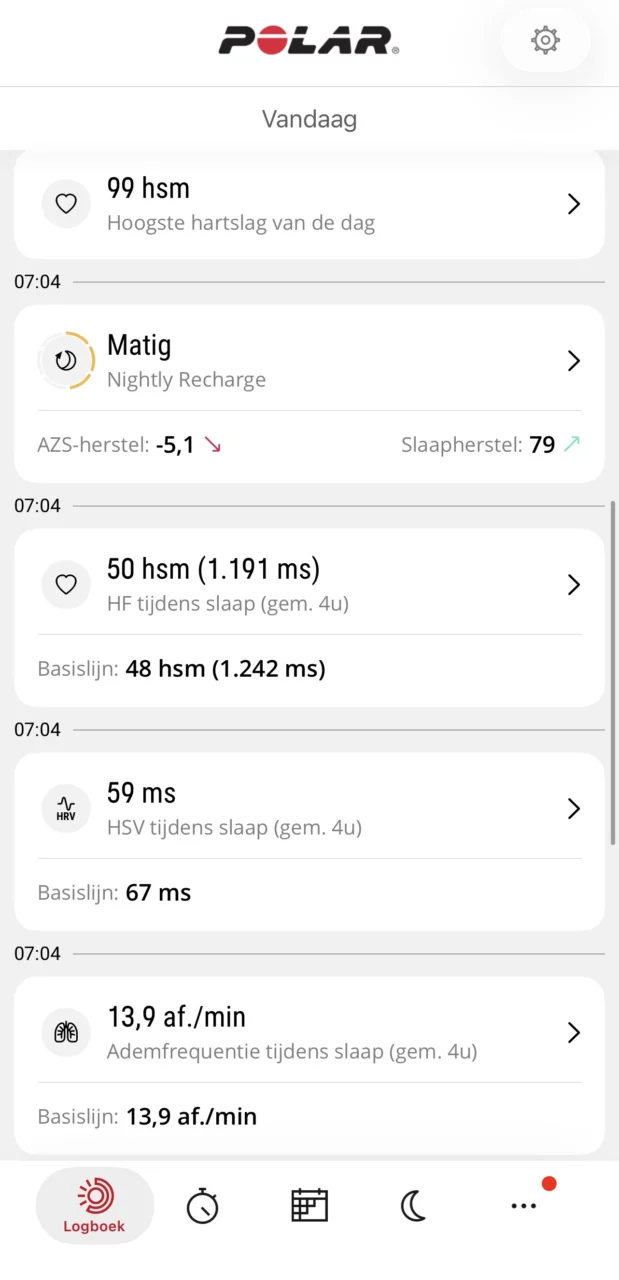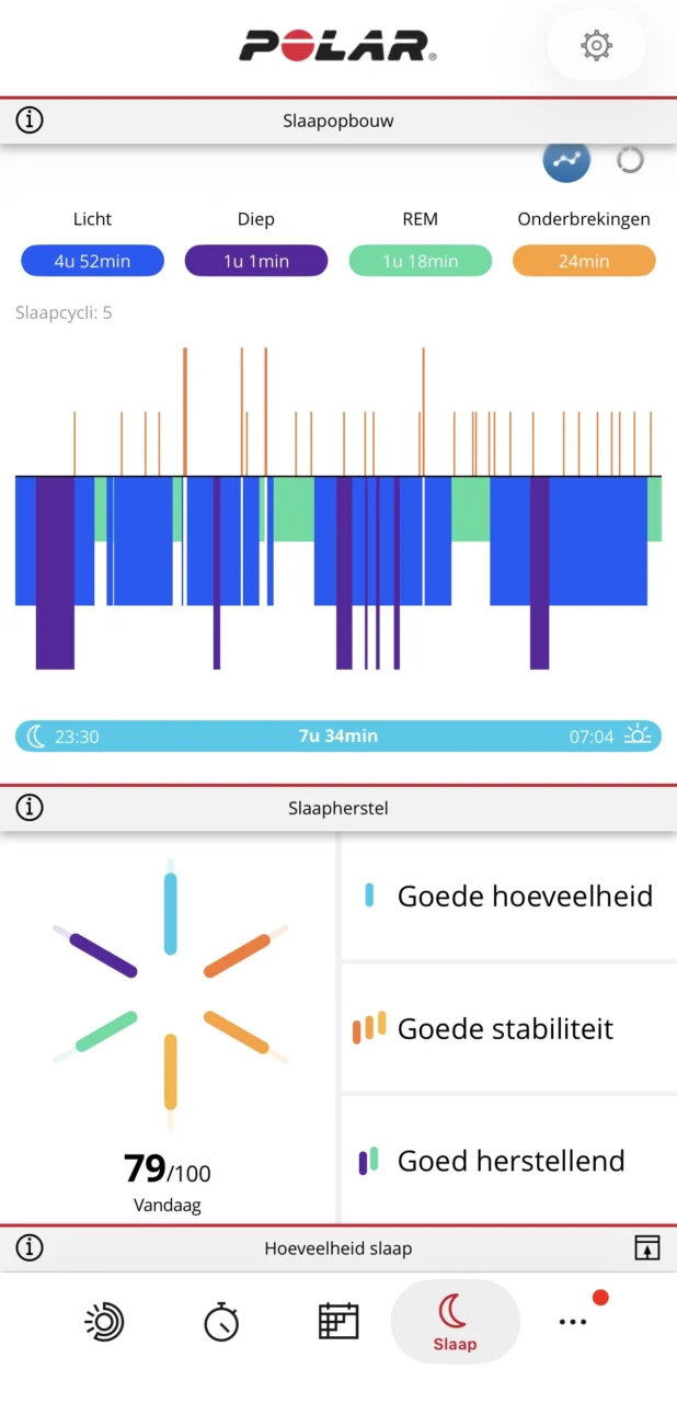 Gezien je de Polar Loop probleemloos kan aanhouden tijdens het slapen, is de slaapmeting een essentiële functie. Daarvoor meet hij je hartritme, hartslagvariabiliteit (HRV) en ademfrequentie. Je ziet niet alleen hoe lang je hebt geslapen, wanneer je in slaap viel en wakker werd, maar ook hoeveel onderbrekingen er waren, hoelang die duurden, hoelang je REM-, diepe en lichte slaap was en hoe goed je hersteld bent. Dat kan je dan nog vergelijken in een weekschema, maar wat ontbreekt is een mooie grafiek over een langere termijn. Zo zou je een tendens kunnen opmerken. Waar je die ruimere grafiek wel vindt (maar waar velen niet meer zoeken) is in de webversie van Polar Flow.