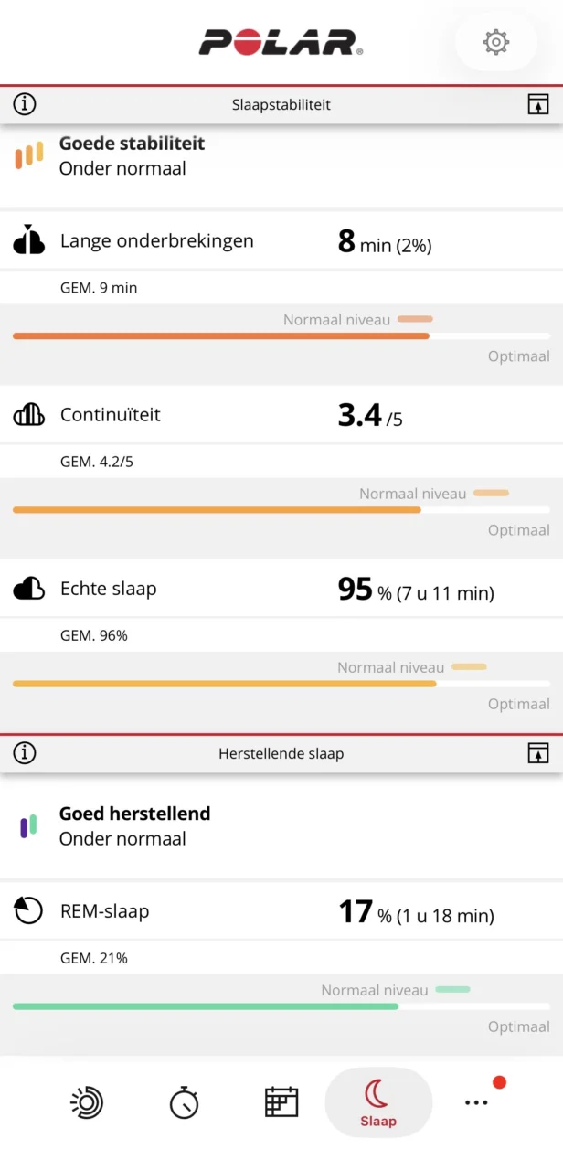De slaapmeting klopte meestal goed met ons gevoel en met mijn Suunto Vertical-smartwatch. Alleen tijdens een nacht met veel en lange onderbrekingen raakte hij in de war. Qua precisie van de meting zit het dus overwegend goed. Daarmee slaagt Polar in zijn opdracht om de voornaamste functies van een dergelijke gezondheidstracker goed te krijgen. Voor de meerderheid van de mensen is het al voldoende om de hartslag wat te kunnen opvolgen, het aantal stappen per dag en de slaap. Wil je echt meer dan dat, dan kijk je misschien zelfs beter naar een gesofisticeerd sporthorloge dan naar een Whoop.