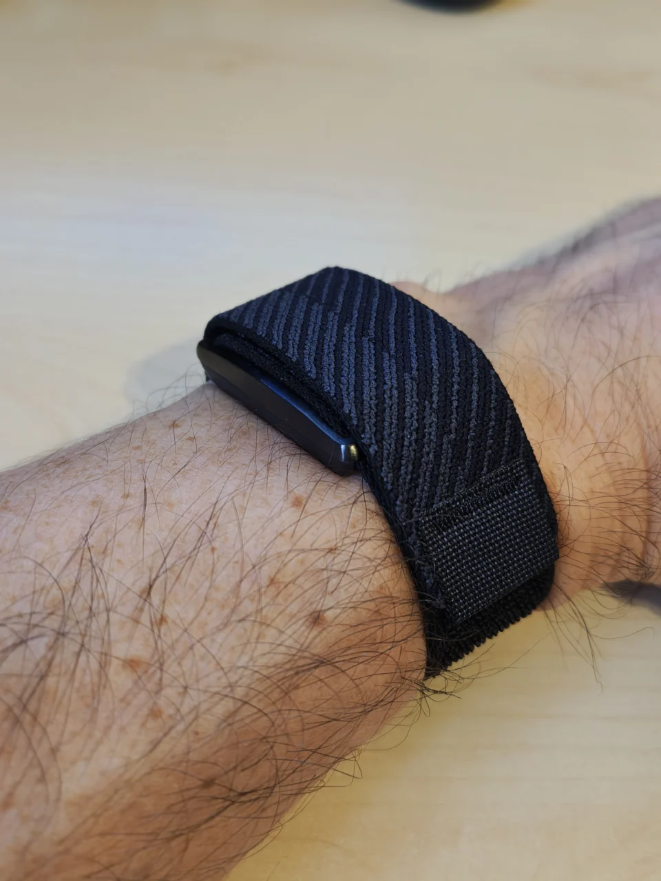 In het doosje vind je de sensor, een polsband in de maat S-M en eentje in M-L en een magnetische laadkabel die je moet aansluiten op een eigen adapter met usb-c-verbinding. Wij konden zowel met de kortere als met de langere polsband overweg. Hij is beschikbaar in het zwart, zandkleur en bruin. Daarnaast kan je voor een extra bandje (19,90 euro) kiezen uit zes kleuren (ook nog oranjerood, bosgroen en donkerblauw). De stof voelt aangenaam rond de arm, waardoor de lichte Polar Loop nog minder hindert. Ook tijdens intensief sporten stoort hij niet. Terwijl een sporthorloge en ook een smart ring in de weg kunnen zitten tijdens bijvoorbeeld het betere werk in de fitnesszaal, merk je nauwelijks dat je de Loop draagt.