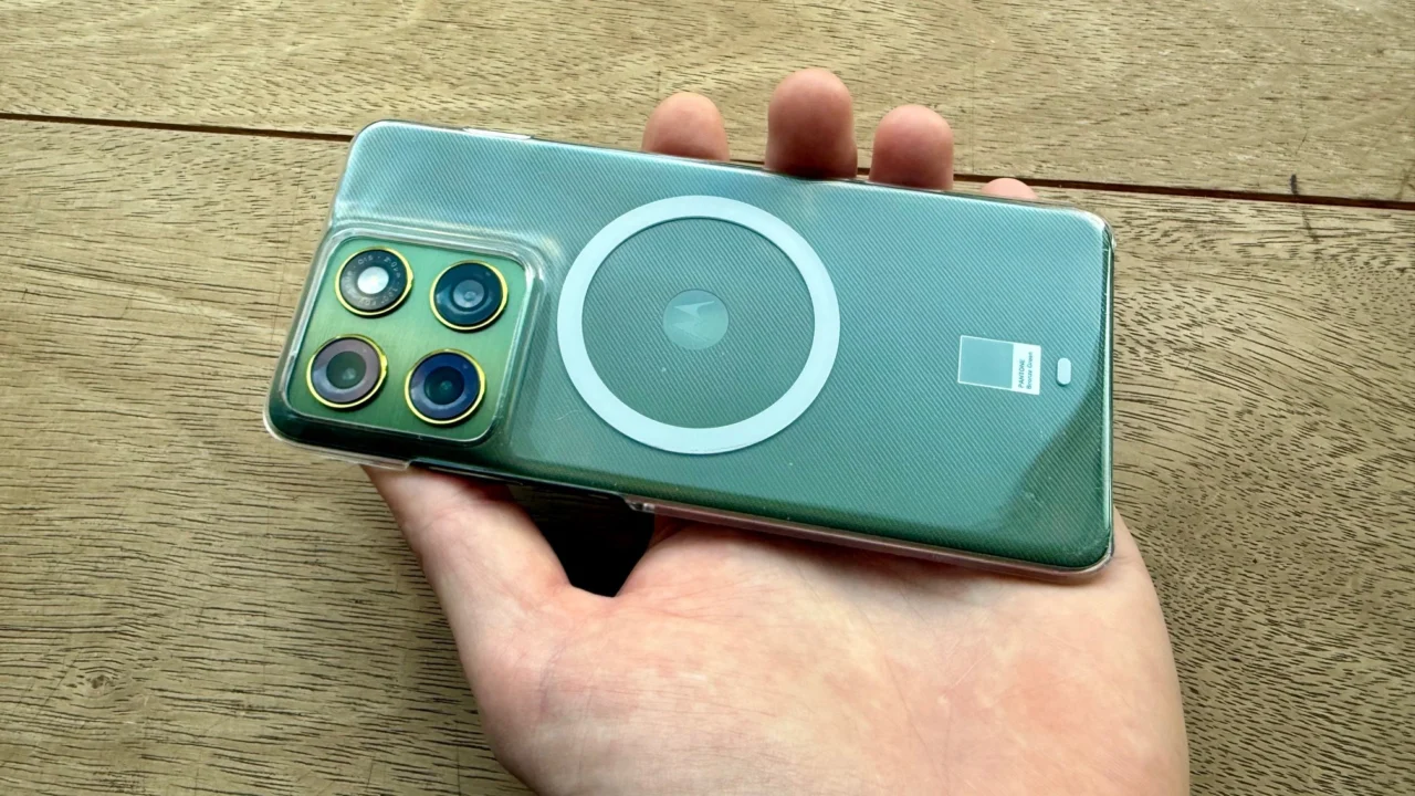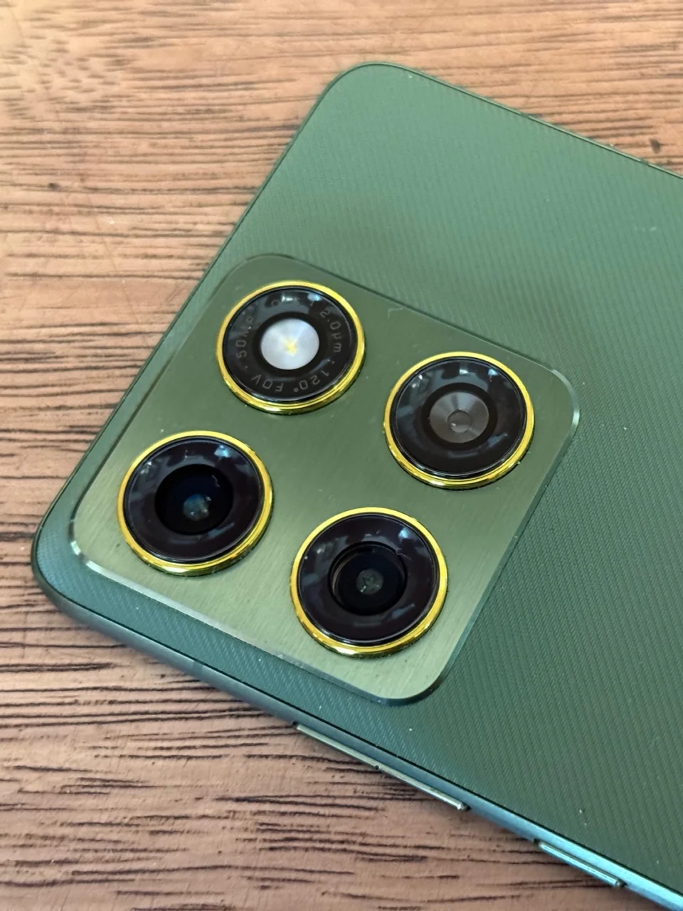 Over vallen gesproken: Motorola levert dit toestel met een gratis, transparant hoesje. Dat zit heel strak rond de Edge en komt er niet snel af, zelfs als je het er zelf wil afhalen. Dan voel je de aangenaam geribbelde achterkant niet meer, maar is je 799 euro (adviesprijs) kostende apparaat wel beschermd tegen impact. De Pantone Bronze Green-kleur is wel nog zichtbaar. De vier goudkleurige boordjes rond de camera- en lichtsensoren creëren trouwens een mooi contrast met de basiskleur.