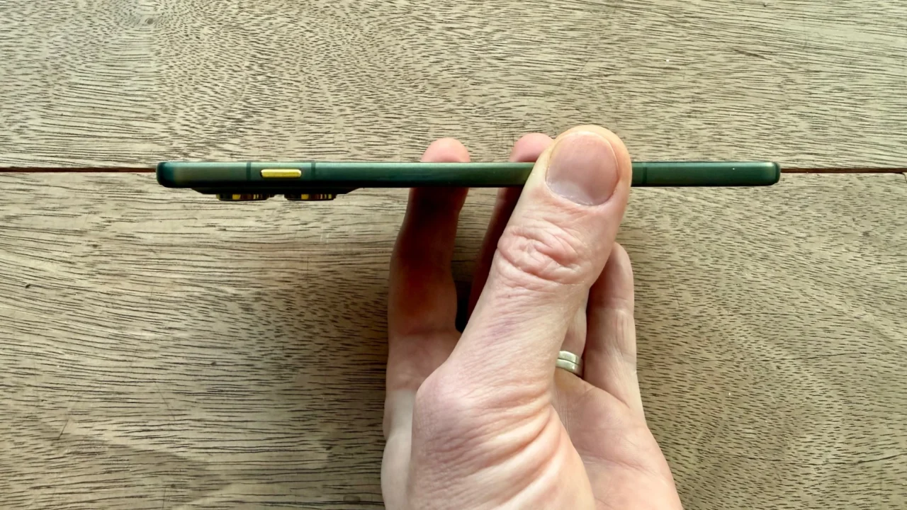 Het pOLED-scherm vult de telefoon bijna volledig. De screen-to-body-verhouding bedraagt 96,32%. Nog geen 4% van de hele voorkant is de omranding. Na drie weken in onze broekzak en bij dagelijks gebruik merkten we nog geen krassen in het glas. Dat verbaasde ons, want het Gorilla Glass 7i is goed, maar er zijn nog krasbestendigere alternatieven.