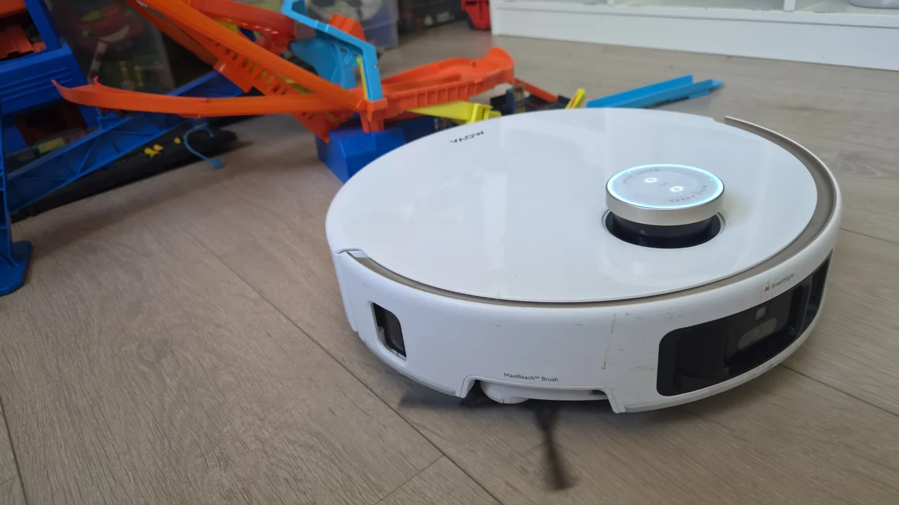 Tijdens het reinigen merk je dat hij heel veel obstakels goed detecteert. Ligt er een kabel of een sok, dan gaat hij zich daar niet in verslikken. Feilloos is die detectie niet, want bijvoorbeeld kleine spullen zoals een speelgoedonderdeel van zo’n anderhalve centimeter lang verdwenen in de buik van de Mova. Je bergt dus maar beter je Legoblokjes op, als je de stofzuigzak niet wil openknippen om op zoek te gaan naar verloren stukjes.