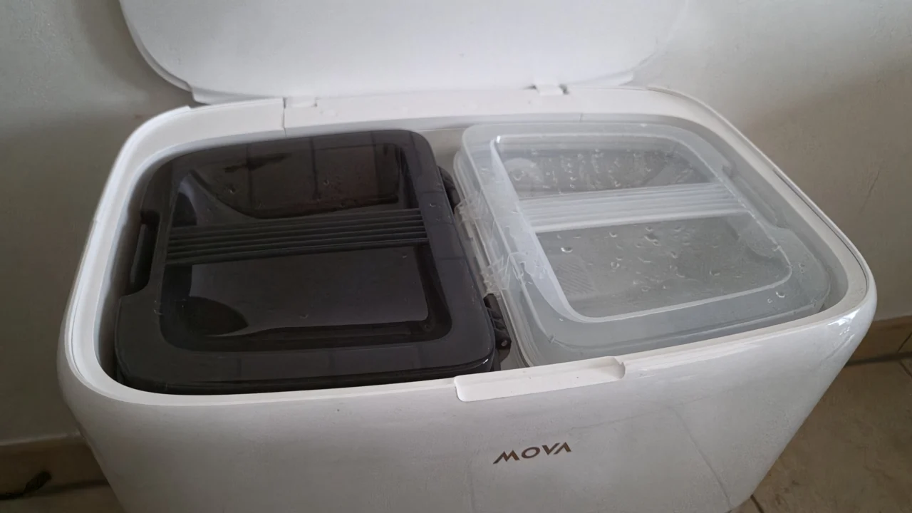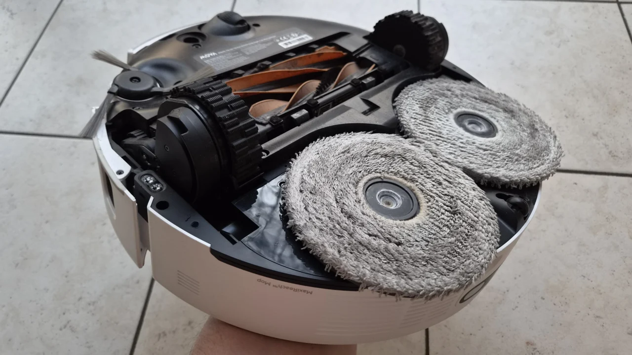 De Mova V50 Ultra Complete heeft twee roterende dweilpads. Die kunnen zelfs vijf graden kantelen om alle hoekjes en kantjes te bereiken en duwen zich neer op de vloer. Met ook nog één dweilpad aan een robotarm die zich kan uitstrekken, blijft in theorie geen plekje vuil achter. In dagelijks gebruik levert dat inderdaad een glanzend schone vloer op. Met twee jonge kinderen die rechtstreeks vanuit de modder het huis betreden, is dat geen overdreven luxe. Diezelfde pagadders durven eveneens te morsen, het liefst met plakkerige goedjes. Ook daar weet de Mova raad mee.