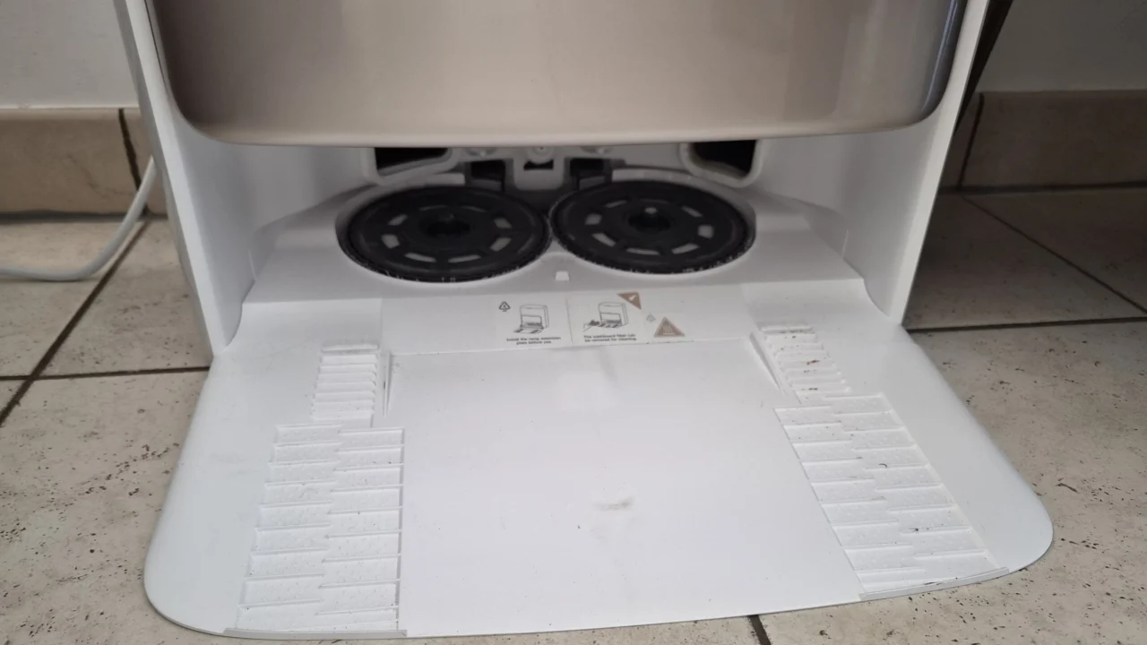 Uiteraard moet al dat vuil weer ergens naartoe. Na zijn taak maakt de robot zijn opvangbak met opgezogen vuil leeg in het basisstation. Daar komt dat terecht in een stofzak die verrassend goed compact wordt gehouden. Daardoor moet je die niet te vaak vervangen. Tijdens het leegmaken van de opvangbak in het basisstation wordt de filter van de robot met een krachtige luchtstoot weer vrijgemaakt. Zo blijft hij voldoende zuigkracht behouden. Ook de dweilpads krijgen hun schoonheidsbehandeling dankzij 20 waterstralen en een warme droogblaasbeurt. Daarnaast krijgen de stofzak en de garage van de robot nog een uv-behandeling om geurtjes te vermijden.