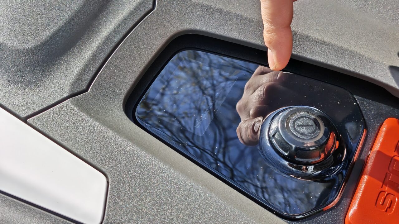 Je zou je misschien kunnen afvragen waarom de nieuwe Nera-maaiers een witte kap hebben, terwijl de vorige volledig zwart waren. Dat is niet zomaar. Onder die witte kap zit de computer. Om oververhitting te vermijden, koos men voor een witte kap, die de warmte van het zonlicht niet absorbeert. Het schermpje op de bovenkant is niet zo goed afleesbaar in volle zon, maar heb je gelukkig ook niet vaak nodig. Enkel als je eens de code moet ingeven of wil zien wanneer de robot de volgende uitrijdt, moet je het bekijken. De bediening gebeurt volledig met de draaiknop, waarbij je moet bevestigen door in te drukken. Dat werkt vlot.