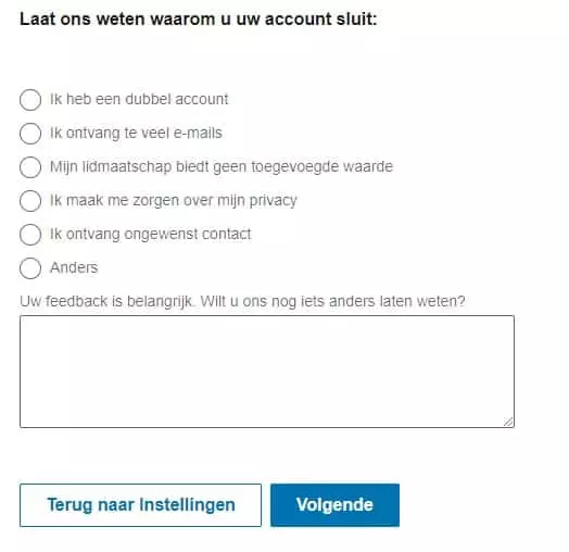 Vervolgens kom je op een pagina terecht waar LinkedIn aan jou vraagt of je zeker weet dat je jouw account wil verwijderen. Je hebt op deze pagina tevens de optie om een reden op te geven waarom je jouw account wil verwijderen. Druk hierna op ‘Volgende’ en je belandt op een pagina waar je uit veiligheidsoverwegingen je wachtwoord moet invoeren. Druk vervolgens op ‘Account Sluiten’ en je bent klaar. Het kan tot zeven dagen duren voordat al jouw informatie van LinkedIn weg is.